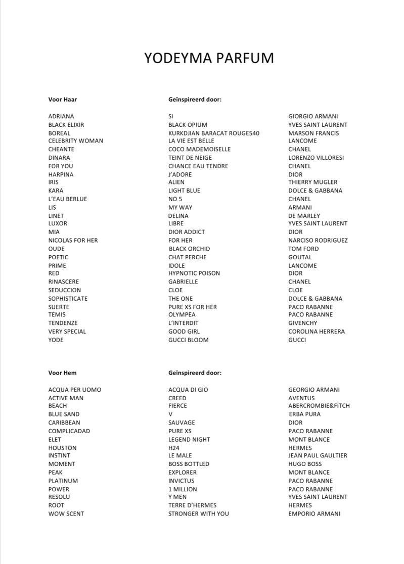 Op zoek naar de lekkerste parfum, maar wil je niet te veel betalen? Op deze pagina vindt je alle parfums. Een geurenwereld met citrusgeuren, aquatische tonen of een frisse geur gecombineerd met de warmte van hout. Al deze kenmerken zijn terug te vinden in de parfums. Met meer dan twintig authentieke heren- en damesparfums hebben wij van Beautysalon MOOii een ruim aanbod. Yodeyma staat bekend om de wereldberoemde geuren. De parfums zijn voordelig geprijsd, maar toch van goede kwaliteit. Alle parfums zijn Eau de Parfum.